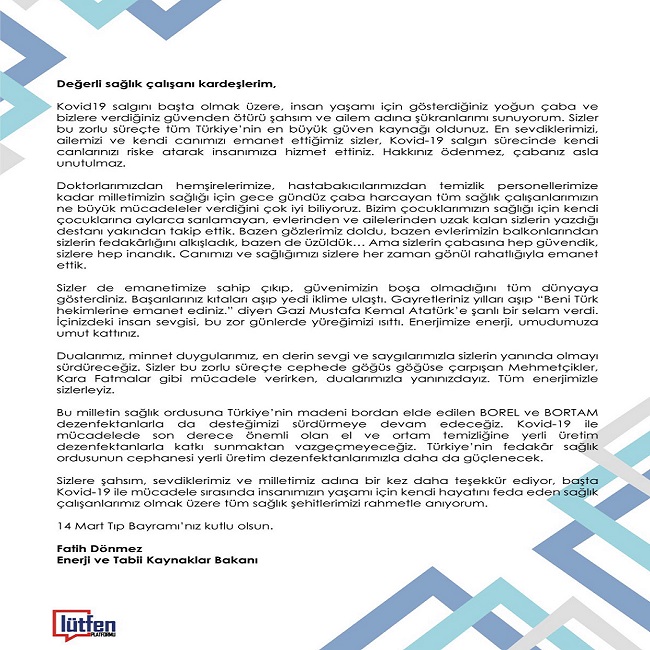 Enerji ve Tabi Kaynaklar Bakanlığı, Bakan Dönmez’in Sağlık Çalışanlarına yazdığı mektubu ‘Sayın Bakanımız Fatih Dönmez, Tıp Bayramı’nda fedakar sağlık çalışanlarımıza hitaben mektup kaleme aldı’ başlığıyla kamuoyuyla paylaştı.