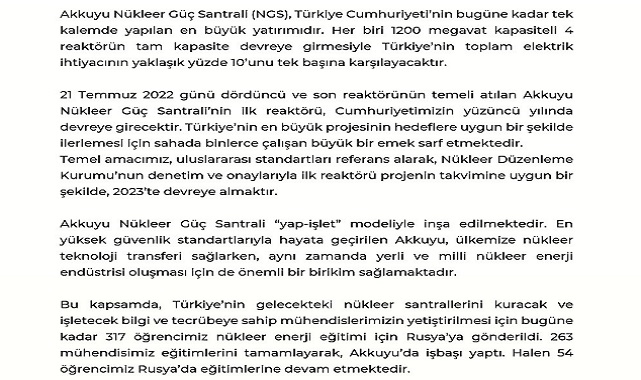 - Akkuyu nükleer santrali ile ilgili kamuoyuna yansıyan tartışma ve açıklamalar üzerine Enerji ve Tabii kaynaklar Bakanlığı açıklama yaptı. Ayrıntılar, haberin içinde.