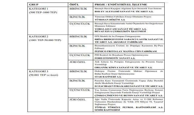 Enerji Bakanlığı... ''Endüstriyel işletmelerin uyguladığı enerji verimli ve çevreye duyarlı projelerin ve teknolojilerin ortaya çıkarılması, tanıtılması ve yaygınlaştırılması, endüstriyel işletmeler arasında bilgi alışverişinin artırılması, enerji verimliliği konusunda yeni ve benzer çalışmaların teşvik edilmesi amacıyla her yıl Sanayide Enerji Verimliliği (SENVER) Proje yarışmaları düzenlenmektedir. Sanayide Enerji Verimliliği Proje Yarışmasına (SENVER-24) toplamda 51 endüstriyel işletme 89 proje ile başvuruda bulunmuştur. Jüri Değerlendirmesi 8 Mayıs 2024 tarihinde gerçekleştirilen yarışmada dereceye giren işletmelerimizin isimleri aşağıda yer almakta olup söz konusu işletmelerimizi tebrik eder, başarılarının devamını dileriz.2'