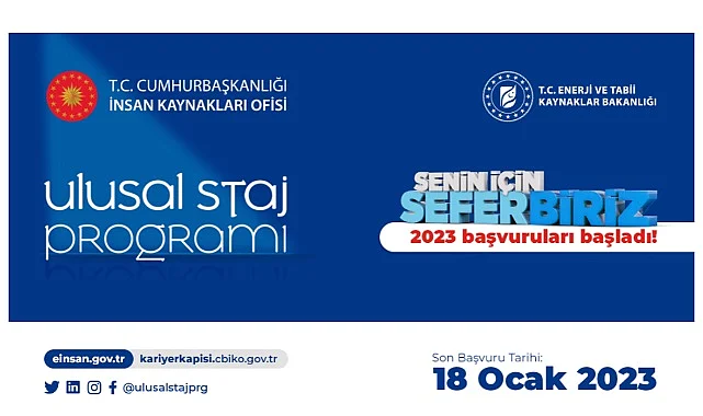Enerji ve Tabii Kaynaklar Bakanlığı (ETKB) duyurusu şöyle: "Fırsat eşitliği çerçevesinde kamu kurumları ve özel sektör kuruluşlarınca sunulan staj olanaklarından faydalanabileceğiniz Ulusal Staj Programı’nın 2023 yılı başvuruları 18 Ekim – 18 Ocak tarihleri arasında https://kariyerkapisi.cbiko.gov.tr adresinden yapılacaktır.