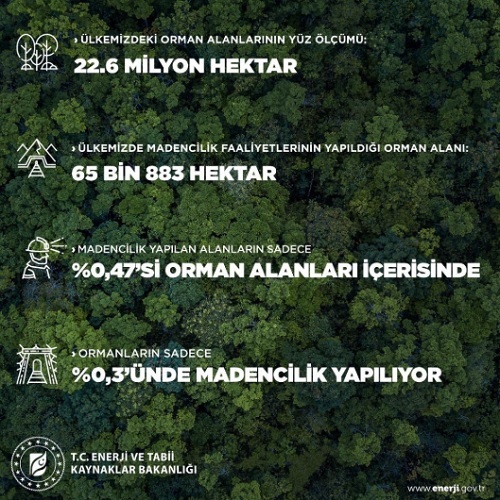 Enerji ve TabiKaynaklar Bakanlığı'nın (ETKB), 'Orman ve Maden' konulu bilgi paylaşımı şöyle: Orman alanları içerisinde kalan maden sahaları sadece %0,47 oranında. Ormanların sadece yüzde 0,3’ünde madencilik yapılıyor.