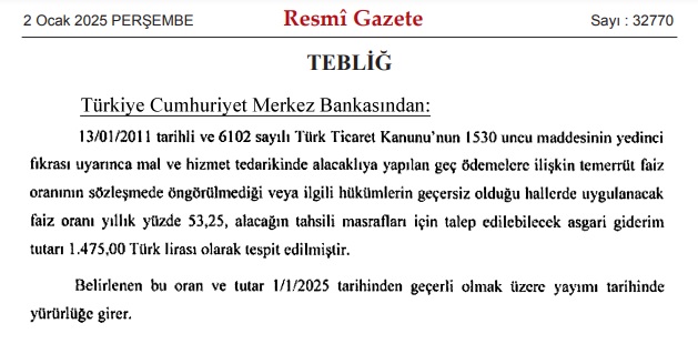 ''Mal ve Hizmet Tedarikinde Geç Ödemelerde Uygulanacak Temerrüt Faiz Oranı ve Alacağın Tahsili Masrafları İçin Talep Edilebilecek Asgari Giderim Tutarı Hakkında Tebliğ'' yayınlandı. 2025 yılı için temerrüt faiz oranı yüzde 53,25 olarak belirlendi.