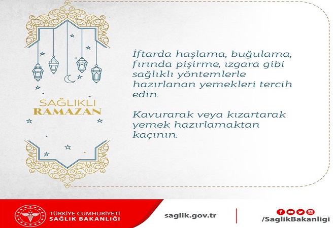 Sağlık Bakanlığı'nın Ramazan iftarlarıyla ilgili önemli bilgi paylaşımı şöyle: 'İftarda haşlama, buğulama, fırında pişirme, ızgara gibi sağlıklı yöntemlerle hazırlanan yemekleri tercih edin. Kavurarak veya kızartarak yemek hazırlamaktan kaçının.'