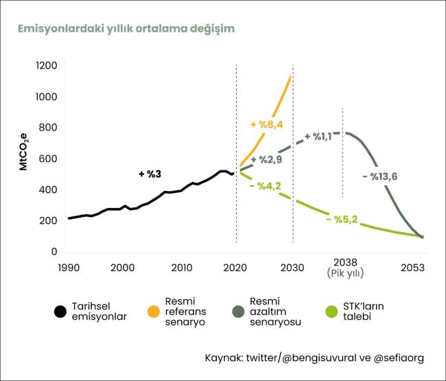 ''Türkiye, geçtiğimiz sene Mısır’da düzenlenen 27. İklim Zirvesi’nde Birleşmiş Milletler İklim Değişikliği Çerçeve Sözleşmesi (BMİDÇS) Sekreteryasına sunduğu Ulusal Katkı Beyanı’nda (NDC, Nationally Determined Contribution) iklim hedefini güncelledi. Türkiye 2030’a kadar artıştan yüzde 41 azaltım hedeflediğini ve iklim eylemleri ile emisyonlarını 700 MtCO2e ile sınırlayacağını açıkladı. Bu artıştan azaltım hedefi, aslında emisyonların 2030’a kadar yüzde 30’dan fazla artması anlamına geliyor.''