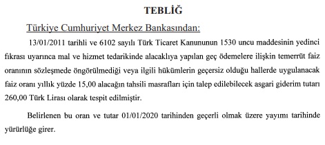 Türkiye Cumhuriyet Merkez Bankası'nın (TCMB) 'Mal ve Hizmet Tedarikinde Geç Ödemelerde Uygulanacak Temerrüt Faiz Oranı ve Alacağın Tahsili Masrafları İçin Talep Edilebilecek Asgari Giderin Tutarına İlişkin Karar' konulu Tebliği bugünkü Resmi Gazetede yayınlandı.