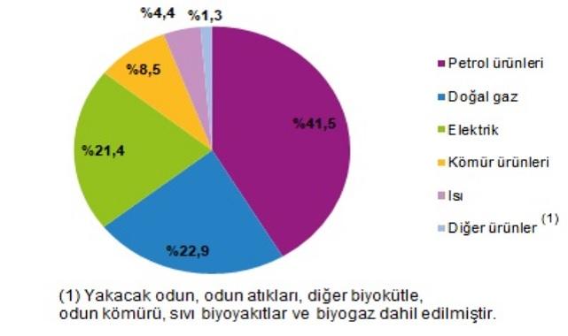 Enerji ürünlerinin nihai kullanımında 2022 yılında petrol ürünleri %41,5 ile ilk sırayı aldı. Petrol ürünlerini sırasıyla, %22,9 ile doğal gaz, %21,4 ile elektrik, %8,5 ile kömür ürünleri, %4,4 ile ısı ve %1,3 ile diğer ürünler takip etti.