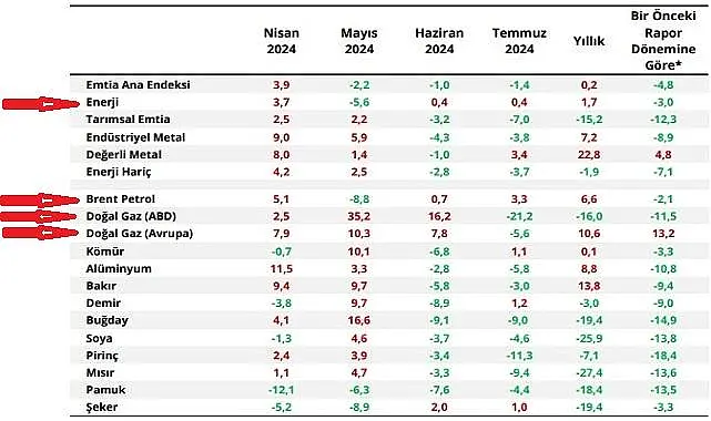- ''Küresel büyüme görünümü ve kompozisyonu, jeopolitik riskler, finansal koşullar ve arz yönlü faktörler, emtia fiyatları üzerinde belirleyici olmaya devam etmektedir. Bahar aylarında üst üste artış gösteren enerji hariç emtia fiyatlarında bir önceki Enflasyon Raporu dönemine göre genele yayılan azalışlar görülmüştür. Diğer taraftan, petrol fiyatlarındaki oynak seyir dikkat çekmektedir. Rusya-Ukrayna ve Orta Doğu’da süregelen jeopolitik gerilimler ile Petrol İhraç Eden Ülkeler Örgütü’ne (OPEC+) üye ülkelerin üretim kesintisi ile ilgili kararları petrol fiyatlarında yukarı yönlü arz baskılarının sürmesine yol açmaktadır. Doğal gaz fiyatlarında da dalgalanmalar gözlenmektedir. Euro Bölgesi büyüme görünümü, ılımlı iklim koşulları ve sıvılaştırılmış doğal gaz (LNG) ithalatındaki artışa bağlı olarak yüksek seyreden doğal gaz stokları Avrupa için gösterge niteliğinde olan fiyatlar üzerinde aşağı yönlü bir etki oluşturmaktadır. Buna karşın doğal gaz fiyatları, bir önceki Enflasyon Raporu dönemine göre yüzde 13,2 oranında artmıştır. Diğer taraftan, küresel büyüme görünümü ve özellikle Çin’in büyümesi ile tarihsel olarak uyumlu bir seyir izleyen endüstriyel emtia fiyatları bir önceki Enflasyon Raporu dönemine göre önemli oranda azalsa da yıllık bazdaki yükselişini korumuştur. ''
