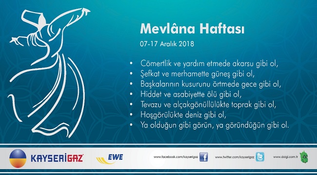 Kayserigaz, Mevlana Haftası nedeniyle sosyal medya üzerinden faydalı ve bilgilendirici bir paylaşım yaptı. Önemine binaen Kaysarigaz (Kayseri Doğalgaz Dağıtım AŞ)'nin paylaşımını aynen yayınlıyoruz.