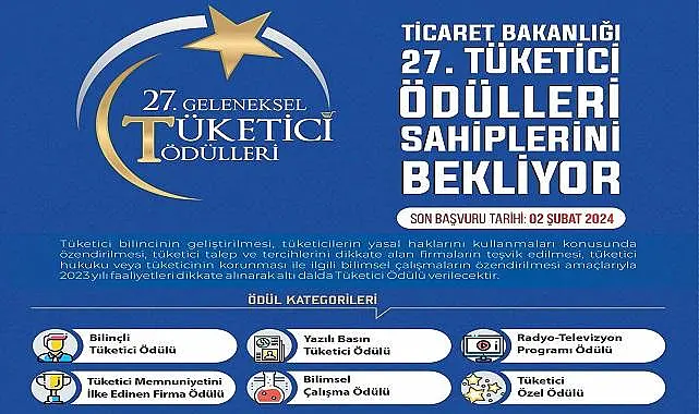 Ticaret Bakanlığı Tüketicinin Korunması ve Piyasa Gözetimi Genel Müdürlüğü: ''Tüketici bilincinin geliştirilmesi, tüketicilerin yasal haklarını kullanmaları konusunda özendirilmesi, tüketici talep ve tercihlerini dikkate alan firmaların teşvik edilmesi, tüketici hukuku veya tüketicinin korunması ile ilgili bilimsel çalışmaların özendirilmesi amaçlarıyla 2023 yılı faaliyetleri dikkate alınarak altı dalda Tüketici Ödülü verilecektir.''