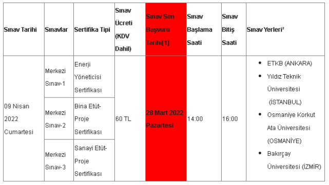 27/10/2011 tarih ve 28097 sayılı Resmi Gazete’ de yayımlanan “Enerji Kaynaklarının ve Enerjinin Kullanımında Verimliliğin Artırılmasına Dair Yönetmelik” ve “Enerji Verimliliği Eğitim ve Sertifikalandırma Faaliyetleri Hakkında Uygulama Usul ve Esasları” hükümleri uyarınca, enerji yöneticisi ve/veya etüt-proje eğitimine katılanlara sertifika verilebilmesi için Enerji ve Tabii Kaynaklar Bakanlığı (ETKB) Enerji Verimliliği ve Çevre Dairesi Başkanlığı (EVÇED) tarafından 09 Nisan 2022 tarihinde düzenlenecek olan MERKEZİ SINAV tarihi, yeri ve sınav ücreti aşağıdaki gibidir.