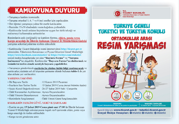 Tüketicinin Korunması ve Piyasa Gözetimi Genel Müdürlüğü’nün duyurusu şöyle: Türkiye genelinde ortaokul öğrencileri arasında düzenlediğimiz “Tüketici ve Tüketim” konulu resim yarışmamıza tüm genç arkadaşlarımızı bekliyoruz.