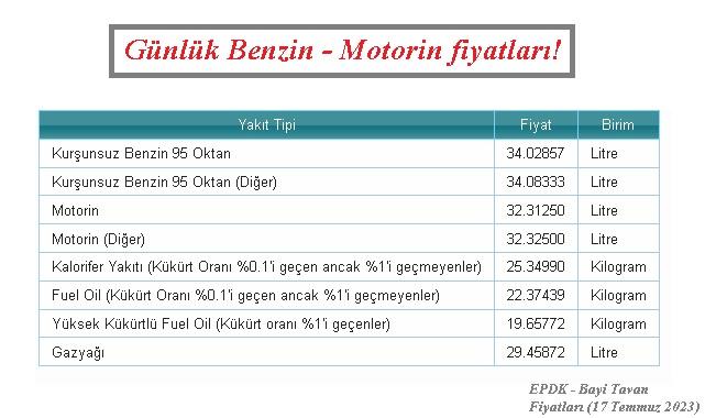 Benzin ve motorinde yapılan ÖTV (Özel Tüketim Vergisi) artışı sonrası olan ilk iş günü, EPDK yeni Bayi Tavan Fiyatlarını açıkladı. EPDK'nın 17 Temmuz 2023 Pazartesi Bayi Satış Fiyat Bülteni'ne göre 1 litre benzinin fiyatı 34,02857 lira ve 1 litre motorinin fiyatı da 32,31250 lira oldu (Ortalama fiyatlar).