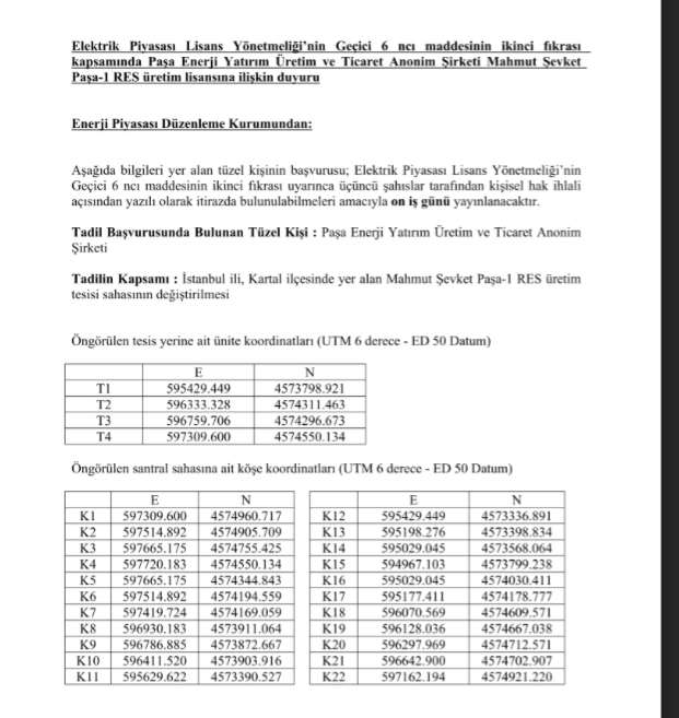 Ayrıntılar: Elektrik Piyasası Lisans Yönetmeliği’nin Geçici 6 ncı maddesinin ikinci fıkrası kapsamında Paşa Enerji Yatırım Üretim ve Ticaret Anonim Şirketi Mahmut Şevket Paşa-1 RES üretim lisansına ilişkin duyuru