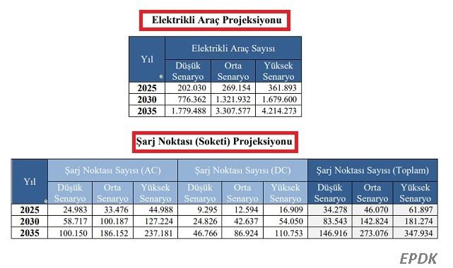 Enerji Piyasası Düzenleme Kurulu (EPDK) duyurusu şöyle: Enerji Piyasası Düzenleme Kurulu’nun 4/4/2024 tarihli ve 12551 sayılı Kurul Kararı ile onaylanan, ülkemizdeki elektrikli araç kullanımı, gelişimi ve şarj altyapısı ihtiyacına yönelik olarak oluşturulan elektrikli araç ve şarj noktası sayısına ilişkin projeksiyon çalışması ekte yer almaktadır.