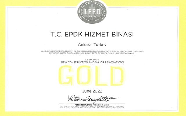 Enerji Piyasası Düzenleme Kurumu (EPDK) hizmet binası ile sektöre öncülük etmeye ve örnek teşkil etmeye devam ediyor. EPDK hizmet binası; bina yapım aşamasından başlayarak yaşam döngüsü çerçevesinde değerlendirilip tasarlanmış, enerji ihtiyacında tasarruflu ve yenilenebilir kaynaklara yönelmiş, çevreci, ekonomik ve sağlıklı bina olma özellikleri ile LEED NC GOLD Sertifikası aldı. Kurum hizmet binası; böylelikle yapısal olarak sürdürülebilirlik ve minimum karbon salımını hedefleyerek enerji konusundaki hassasiyetini belgeleyerek, LEED NC GOLD sahibi sayılı binadan biri oldu.