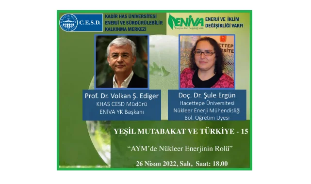 Kadir Has Üniversitesi Enerji ve Sürdürülebilir Kalkınma Merkezi (CESD) ile Enerji ve İklim Değişikliği Vakfı (ENİVA) tarafından düzenlenen “Yeşil Mutabakat ve Türkiye-15” etkinliği, 26 Nisan Salı günü 18:00-19:00 arasında gerçekleştirilecektir.