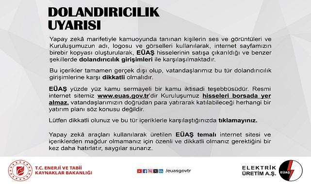 - Sosyal medyada çıkan reklam dolandırıcıkları ile ilgili EÜAŞ uyarısını aşağıda okuyabilirsiniz...