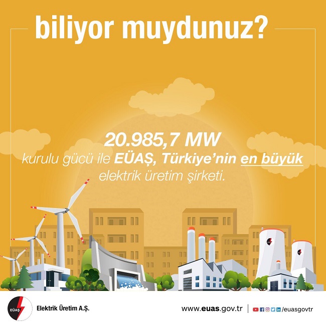 Elektrik Üretim AŞ (EÜAŞ), sosyal medya üzerinden paylaştı. İşte o paylaşım: '20.985,7 MW kurulu gücü ile EÜAŞ, Türkiye’nin en büyük elektrik üretim şirketi.'