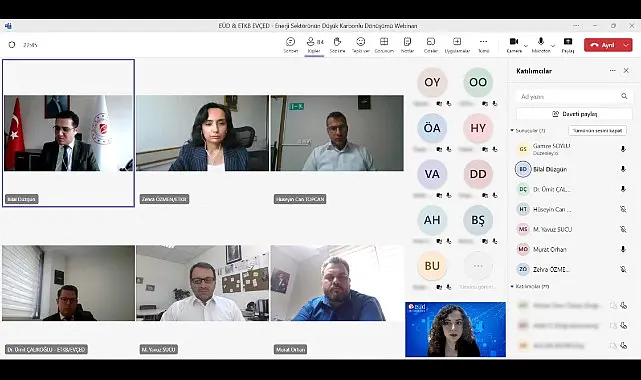 EÜD, bilgi paylaşımı yaptı... "Enerji ve Tabii Kaynaklar Bakanlığı Enerji Verimliliği ve Çevre Dairesi (EVÇED) ile düzenlediğimiz “Enerji Sektörünün Düşük Karbonlu Dönüşümü” toplantısını çok sayıda üyemizin katılımıyla online olarak gerçekleştirdik!