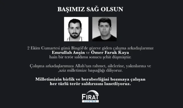 Fırat EDAŞ (Fırat Elektrik Dağıtım AŞ): 'Bingöl’de göreve giden çalışma arkadaşlarımız Emrullah Anşin ve Ömer Faruk Kaya hain terör saldırısı sonucu şehit düşmüştür. Çalışma arkadaşlarımıza Allah’tan rahmet, ailelerine, yakınlarına ve aziz milletimize başsağlığı diliyoruz.'