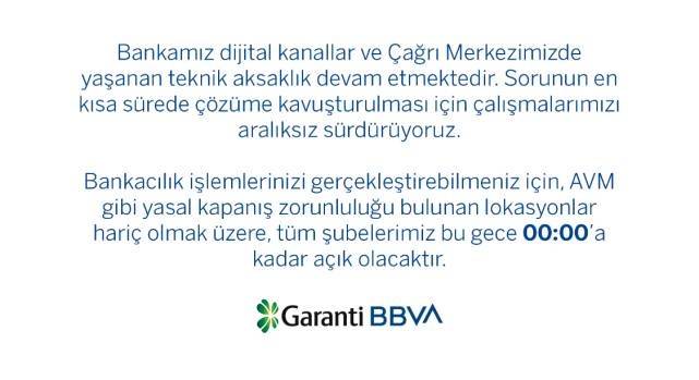 Garanti BBVA ''Bankamız dijital kanallar ve Çağrı Merkezimizde yaşanan teknik aksaklık devam etmektedir. Sorunun en kısa sürede çözüme kavuşturulması için çalışmalarımızı aralıksız sürdürüyoruz.