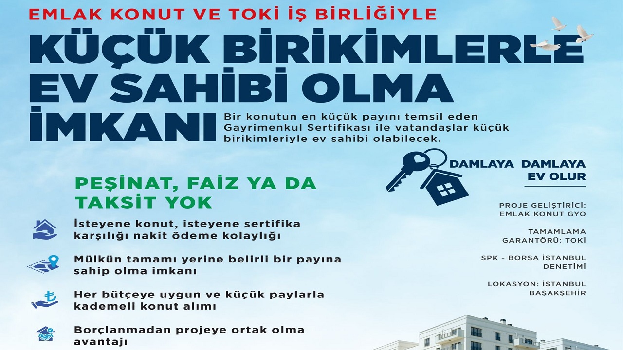TOKİ ve Emlak Konut güvencesinde küçük birikimlerle ev sahibi olma imkanı sunan Gayrimenkul Sertifikası uygulaması başladı. Bu yeni gelişmeyi, Çevre, Şehircilik ve İklim Değişikliği Bakanı Murat Kurum sosyal medya hesabı üzerinden duyurdu.