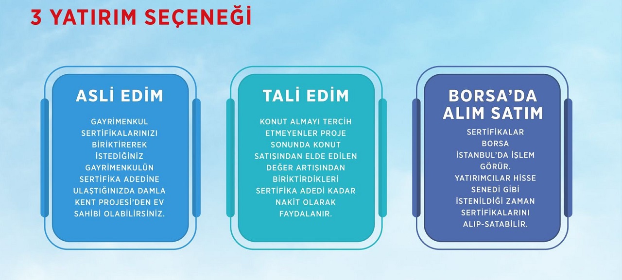 Üstelik küçük birikimlerle başlayabilirsiniz. Sertifika biriktiren yatırımcı, proje sonunda yeterli sertifika karşılığında konut sahibi olabilir (asli edim) ya da birikimini nakde dönüştürerek gelir elde edebilir (tali edim).
