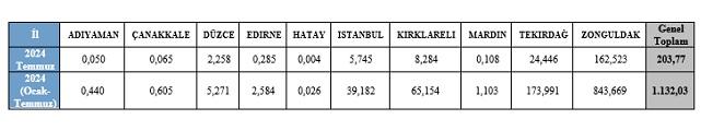 EPDK verilerine göre (Temmuz 2024, aylık) Türkiye'de en fazla doğal gaz Zonguldak'ta üretiliyor. Zonguldak'ta aylık 162,5 milyon metreküp (m3) doğal gaz üretimi gerçekleşti. Zonguldak'ı aylık 24,4 milyon metreküp ile Tekirdağ 2. sırada ve aylık 8,2 milyon metreküp ile de Kırklareli 3. sırada izledi. Türkiye'nin aylık doğal gaz üretimi ise 203,7 milyon metreküp oldu. (Veriler için kaynak: Enerji Piyasası Düzenleme Kurumu - EPDK. Temmuz 2024 Üretim Verileri, Aylık Sektör Raporu).