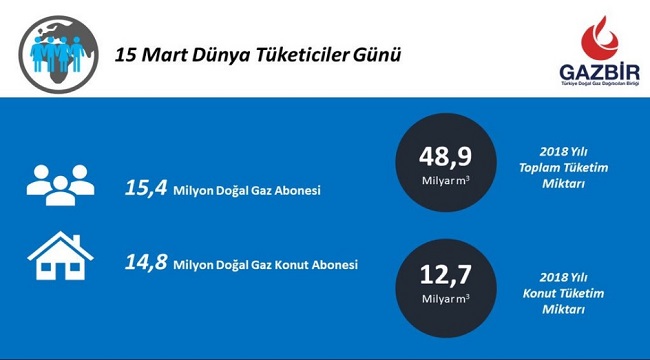 Bugün 15 MartDünya Tüketiciler Günü. Doğal gaz dağıtım şirketlerinin temsilci kuruluşu GAZBİR, 15 Mart Dünya Tüketiciler Günü nedeniyle bir kutlama mesajı yayınladı. GAZBİR'in (Türkiye Doğal Gaz Dağıtıcıları Birliği) kutlama mesajı şöyle: 15,4 milyon abonesi ve 50 milyondan fazla kullanıcısıyla her gün büyüyen Doğal Gaz Dağıtım Sektörü adına tüm tüketicilerimizin '15 Mart Dünya Tüketiciler Günü”nü kutlarız'.