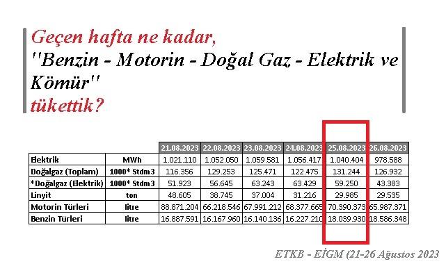 Resmi verilere göre Türkiye geçen hafta 1 milyar kwh (klowatsaat) civarı elektrik, 131 milyon metreküp civarı doğal gaz, 29 bin ton civarı kömür (linyit), 70 milyon litre civarı motorin ve 18 milyon litre civarı benzin tüketti. Türkiye enerji tüketimi benzin hariç cuma günleri zirve yapıyor. Buna karşın benzin tüketimi hafta sonların (cumartesi - pazar) artışa geçiyor.
