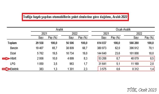 - - 'Yakıt türlerine (cinslerine) göre 2022 yılı Türkiye elektrikli ve hibrit araç satışları' için aşağıdaki tabloya bakınız...