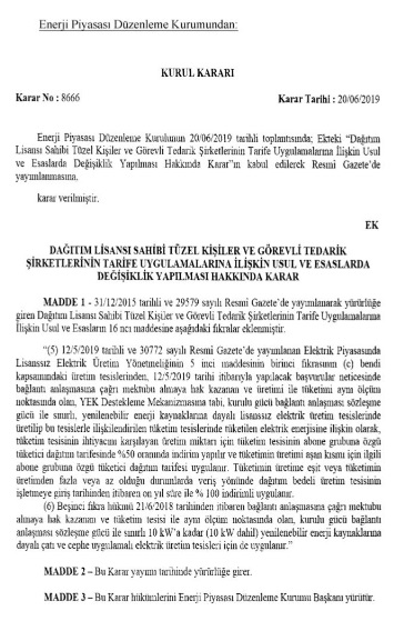 -Mahsuplaşma sonucu tüketimin fazla olduğu kısım için kendi tüketici dağıtım tarifesi, - Mahsuplaşma sonucu üretimin fazla olduğu kısım için 10 yıl süresince kendi tüketici dağıtım tarifesinden yüzde 100 indirim, uygulanacaktır.