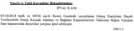 Enerji ve Tabi Kaynaklar Bakanlığı'nın iptalle ilgili duyurusu şöyle: Güneş Enerjisine (GES) dayalı Yenilenebilir Enerji Kaynak Alanları ve Bağlantı Kapasitelerinin Tahsisine İlişkin Yarışma İlanı kapsamında duyurulan yarışma iptal edilmiştir. Bakanlığın duyurusu bugünkü Resmi Gazetede yayınlandı. Yeni duyuru güneş - solar enerji sektörünü yakından ilgilendiriyor.