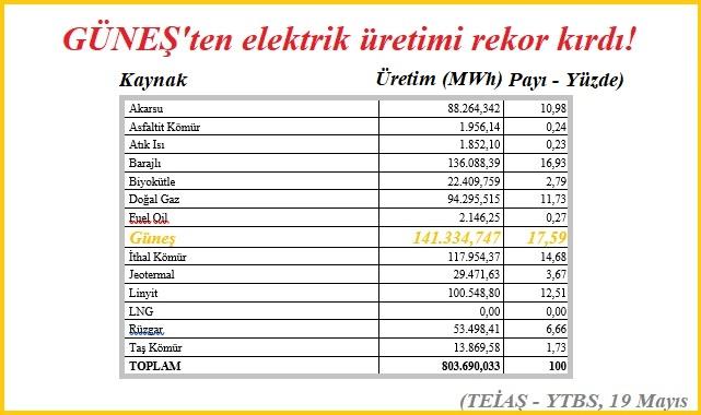 TEİAŞ (Türkiye Elektrik İletim AŞ) Yük Tevzi Bilgi Sistemi Başkanlığı (YTBS) verilerine göre (19 Mayıs 2025), Türkiye toplam elektrik üretiminde GES'lern payı yüzde 17,59 oldu. GES'lein yerli ve yenilenebilir enerji kaynağı olması nedeniyle bu üretim rekoru önem arzediyor. Aynı gün Türkiye elektrik üretiminde RES'lerin payı ise yüzde 6,66 oldu.