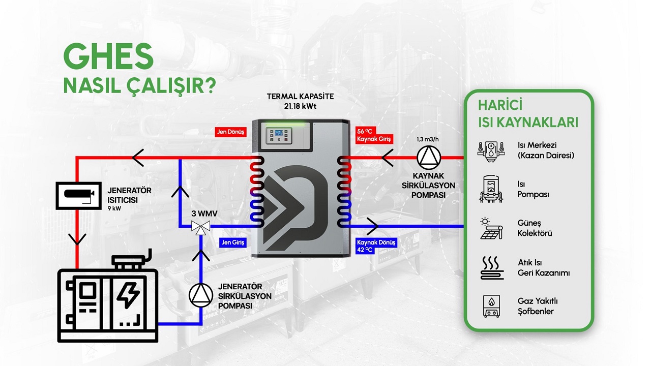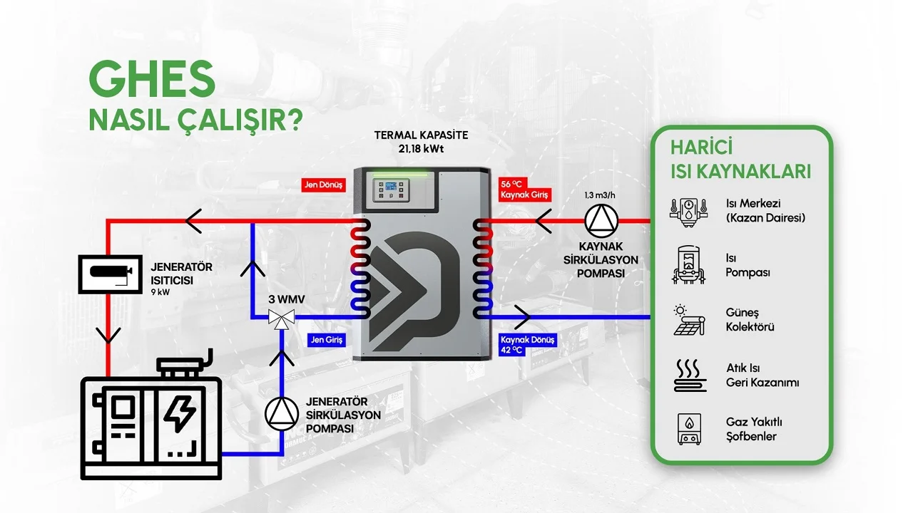 GHES, jeneratör setlerine entegre edilen akıllı bir ısıtma enerji verimliliği sistemidir. Amaç, motor ceket suyunu istenen sıcaklıkta tutmak için gereken enerjiyi olabilecek en düşük maliyet ve emisyonla sağlamak. Bunu yaparken klasik elektrik rezistansına bağımlılığı azaltır; bunun yerine tesisinizde zaten var olan veya eklenebilecek ısı merkezi (kazan dairesi), ısı pompası, güneş kolektörleri, atık ısı geri kazanımı, gaz yakıtlı şofbenler gibi alternatif kaynakları devreye alır.