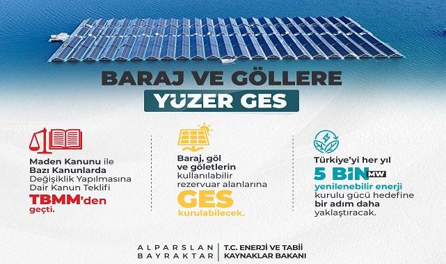 Baraj ve göllerin rezervuar alanlarına güneş enerjisi santralleri (Yüzer GES) kurulması ile karbonsuz elektrik arzımız artacak. Böylece ekonomimizin karbon fiyatlama yükünün azaltılmasına da katkı sağlanacak.