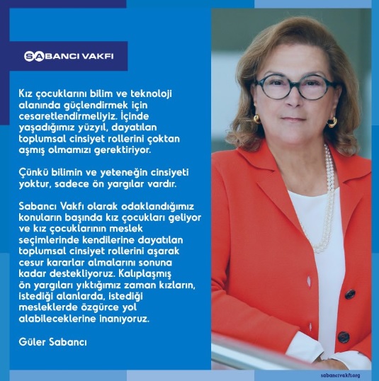 Sabancı Vakfı Mütevelli Heyeti Başkanı Güler Sabancı, Dünya Kız Çocukları Günü nedeniyle bir mesaj yayınladı. Sabancı Vakfı'nın konuyla ilgili bilgi paylaşımı şöyle: Mütevelli Heyeti Başkanımız Güler Sabancı’dan #DünyaKızÇocuklarıGünü.