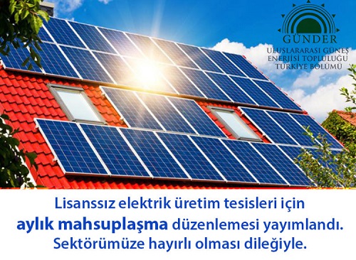 GÜNDER'in (Uluslararası Güneş Enerjisi Topluluğu – Türkiye Bölümü) sosyal medya üzerinden konuyla ilgili yaptığı bilgilendirme şöyle: Elektrik Piyasasında Lisanssız Elektrik Üretim Yönetmeliği, Enerji Piyasası Düzenleme Kurumu (EPDK) tarafından 12 Mayıs 2019 tarifli Resmi Gazete'de yayımlanarak yürürlüğe girdi. Lisanssız elektrik üretim tesisleriyle ilgili olarak özellikle güneş enerjisi sektörünün merakla beklediği aylık mahsuplaşma düzenlemesi de yenilenen yönetmelikte belirlendi.