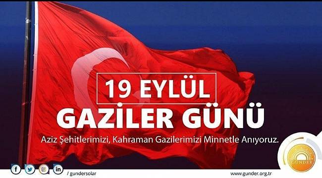 Güneş enerjisi sektörünün temsilci kuruluşlarından GÜNDER Gaziler Günü nedeniyle mesaj yayınladı: Aziz şehitlerimizi, kahraman gazilerimizi minnetle anıyoruz.