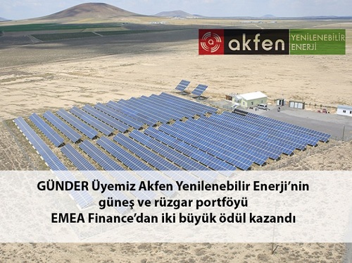 GÜNDER'in konuyla ilgili bilgi paylaşımı şöyle: GÜNDER Üyemiz Akfen Yenilenebilir Enerji, geçen yıl yapımına başladığı toplam 530 milyon dolar değerindeki 4 rüzgar ve 9 güneş santrali projesi ile EMEA Finance tarafından düzenlenen EMEA Finance Project Finance Awards 2018 etkinliğinde 2 prestijli ödül aldı.