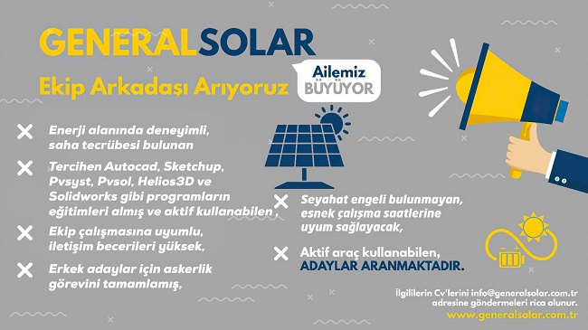 GÜNDER (Uluslararası Güneş Enerjisi Topluluğu – Türkiye Bölümü): Üyemiz General Solar Ekip Arkadaşları arıyor.