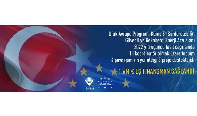 TÜBİTAK... Ufuk Avrupa Programı, Küme 5: İklim, Enerji, Mobilite, “Hedef 3- Sürdürülebilir, Güvenli ve Rekabetçi Enerji Arzı” bileşeni altında yer alan 2022 yılı üçüncü fasıl çağrılarına ilişkin başvuru sonuçları açıklanmıştır. 6 Eylül 2022 – 10 Ocak 2023 tarihleri arasında başvuruları açık kalan 9 çağrı başlığı kapsamında, 159 proje ile rekabet etmiş ve 25 proje Avrupa Komisyonu tarafından hibe almaya hak kazanmıştır. Bu kapsamda, ülkemizden 1'i koordinatör olmak üzere toplam 4 kuruluşumuzun yer aldığı 3 proje desteklenmiş, toplamda 1.604.637,50 Avro eş finansman sağlanmıştır.