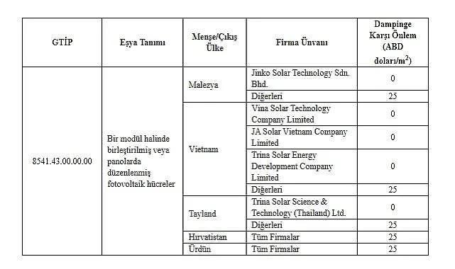 (3) Bu çerçevede, soruşturma neticesinde ulaşılan tespitleri değerlendiren Kurulun kararı ile İthalatta Haksız Rekabetin Önlenmesine İlişkin Tebliğ (Tebliğ No: 2023/26) kapsamında ÇHC menşeli ithalatta yürürlükte bulunan dampinge karşı önlemin, Malezya’da yerleşik Jinko Solar Technology Sdn. Bhd., Vietnam’da yerleşik Vina Solar Technology Company Limited, JA Solar Vietnam Company Limited ve Trina Solar Energy Development Company Limited ve Tayland’da yerleşik Trina Solar Science & Technology (Thailand) Ltd. firmalarınca üretilen eşya hariç olmak üzere, Hırvatistan, Malezya, Tayland, Ürdün ve Vietnam menşeli/çıkışlı olarak yapılan ithalata tabloda gösterildiği şekilde teşmil edilmesine karar verilmiştir.