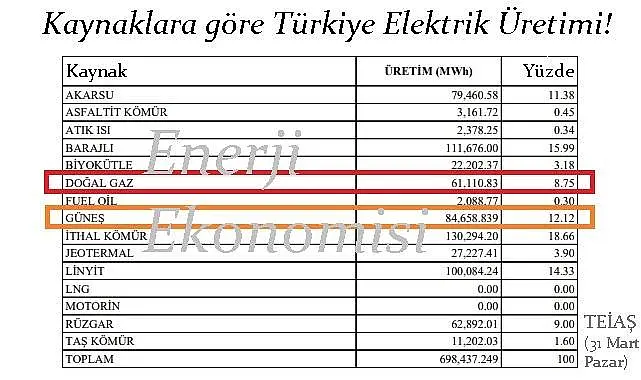Havaların ısınmasıyle GES'ler (Güneş enerjisi santralleri üretim rekoru kırmaya başladı. Türkiye'nin mahalli idareler seçimlerini yaptoğı pazar günü GES'ler, Türkiye toplam elektriğinin yüzde 12'simni üretti. Aynu gün ise doğalgaz santrallerinin elektrik ürettimindeki payı yüzde 8 oldu.
