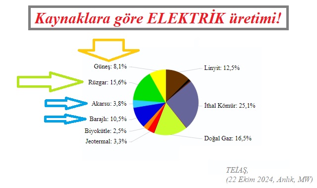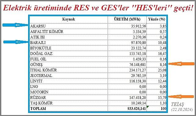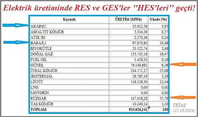 TEİAŞ (Türkiye Elektrik İletim AŞ) - YTBS günlk üretim verilerine göre (22 Ekim 2024 Salı, günlük üretm), Türkiye toplam elektrik üretiminin yaklaşık yüzde 23'ünü GES ve RES'ler üretti. Aynı gün Akarsu HES ve Barajlı HES'lerin toplam üretiminin ise yaklaşık yüzde 14'ünü üretti.