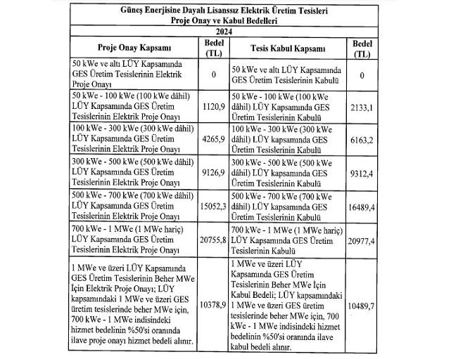 - Lisanssız güneş enerjisinden elektrik üretmek isteyenlerin ''proje onay ve kabul işlemleri'' ücretleri!
