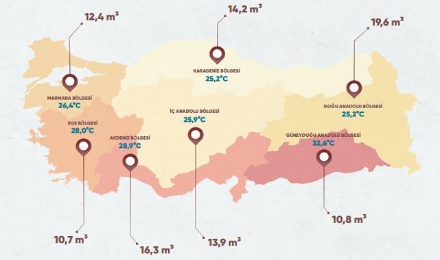 - Mavi renk sıcaklık, diğer renk ortalama hane başı tüketim (m3) miktarlarıdır.
