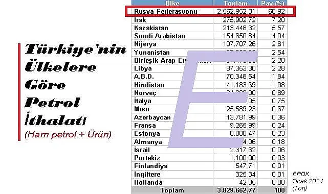 Türkiye, en fazla petolü (Ham petrol ve petrol ürünleri) Rusya'dan alıyor. Resmi verilere göre Ocak ayında ithal edilen petrolün yaklaşık yüzde 67'si, Rusya'dan ithal edildi. Ancak, akaryakır mevzuatına göre Türkiye'de satışa sunulan benzin ve motorim türü ürünlerin fiyatı, İtalya Cenova piyasasında oluşan fiyatlara göre belirleniyor.