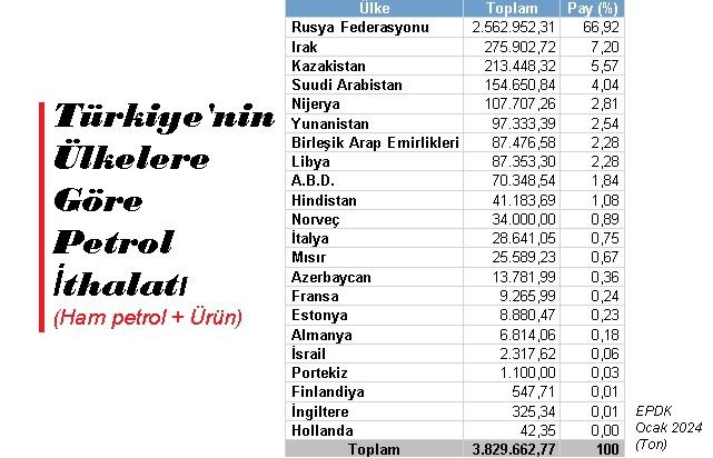Türkiye, en fazla petolü (Ham petrol ve petrol ürünleri) Rusya'dan alıyor. Resmi verilere göre Ocak ayında ithal edilen petrolün yaklaşık yüzde 67'si, Rusya'dan ithal edildi. Ancak, akaryakır mevzuatına göre Türkiye'de satışa sunulan benzin ve motorim türü ürünlerin fiyatı, İtalya Cenova piyasasında oluşan fiyatlara göre belirleniyor.