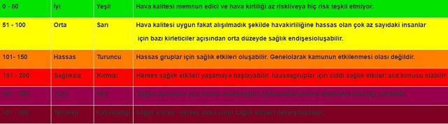Kötü hava (200 - 300): Nüfusun tamamının hava hava kirliliğinden etkilenme olasılığı olup, hassas gruplar açık hava etkinliklerini kısıtlamalıdır.